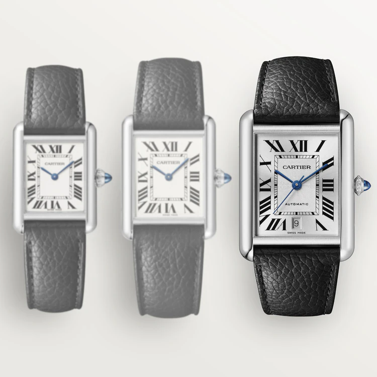Tank Must watch, extra-large model, Manufacture mechanical movement with automatic winding, caliber 1847 MC. Steel case, beaded crown set with a synthetic cabochon-shaped spinel, silvered flinqué dial, blued-steel sword-shaped hands, interchangeable black grained calfskin strap, interchangeable steel deployant buckle, calendar aperture at 6 o’clock. Case dimensions: 41 mm x 31 mm, thickness: 8.4 mm. Water-resistant up to 3 bar (approx. 30 meters/100 feet).