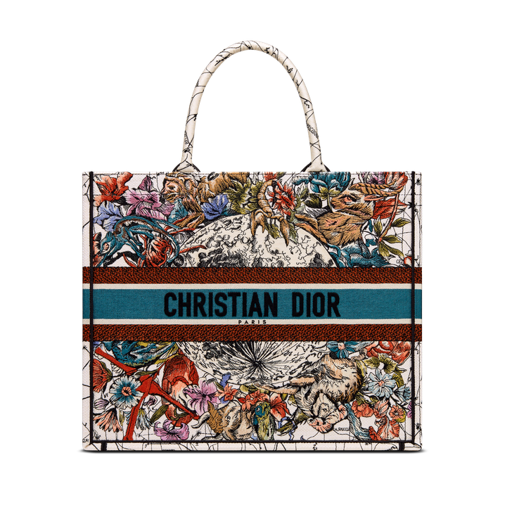 Introduced by Maria Grazia Chiuri, Creative Director of Christian Dior, the Dior Book Tote has become a staple of the Dior aesthetic. Designed to hold all the daily essentials, it is fully embroidered with the latte multicolor Dior Zodiac motif, a variation of the iconic pattern that incorporates Mr. Dior’s passion for astrology. Adorned with the Christian Dior Paris signature on the front, the large tote exemplifies the House’s signature savoir-faire and may be carried by hand or worn over the shoulder.